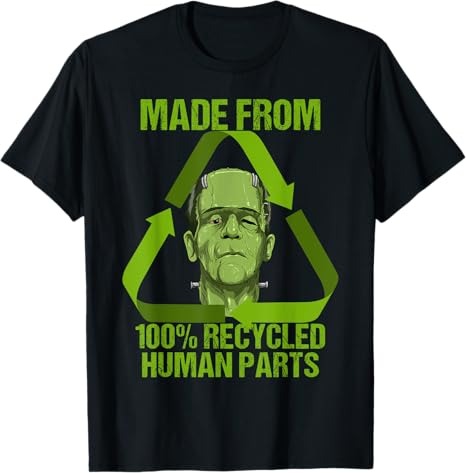 We use DTG Technology to print Frankenstein Made From 100% Recycled Human Parts Halloween T-Shirt.